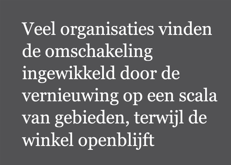 In onze ervaring zijn transformaties niet altijd succesvol. Veel organisaties vinden de omschakeling ingewikkeld door de vernieuwing op een scala van gebieden, terwijl de winkel openblijft. Bijvoorbeeld de overgang naar een andere dienstverlening, teamstructuur en IT-omgeving, waarbij klanten gewoon moeten worden bediend, producten gefabriceerd en salarissen betaald. Ook is de vernieuwing in de praktijk voor elke organisatie anders en is aan het begin van het traject het einddoel veelal nog deels ongewis. Dat vraagt van de organisatie een doordachte, gerichte aanpak voor de transitie met ruimte om te innoveren. Tegelijkertijd is juist van belang dat de organisatie voldoende wendbaar blijft om op basis van voortschrijdend inzicht te leren en de veranderingen gaandeweg verder in te vullen, of wellicht halverwege deels om te gooien. Dit verlangt dus voor de transformatie enerzijds duidelijke strategische keuzes en anderzijds ruimte voor werkenderwijs een stapsgewijze uitwerking. Wij zetten vanuit de praktijk voor transformeren 8 kerninzichten op een rij.